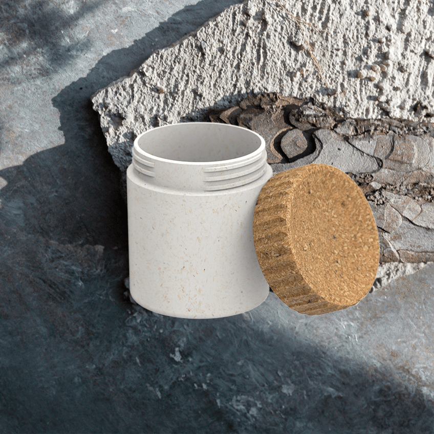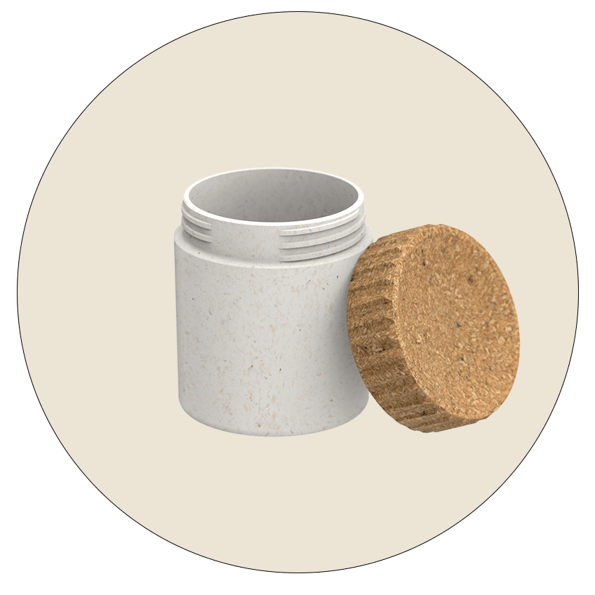 123 ml Volumatik. Round-shaped premium sustainable cosmetic supplement jar. Made of patented two-layer structured bio-based Sulapac Premium (SUL-P) with Volumatik neck finish. Collection Volumatik is a high quality recyclable and compostable packaging solution for water-based cosmetic applications. Outer layer has large visible wood chips in its surface. Dimensions: (D x H) 58 mm x 73 mm and a weight of 85 gram.